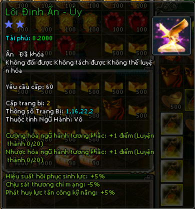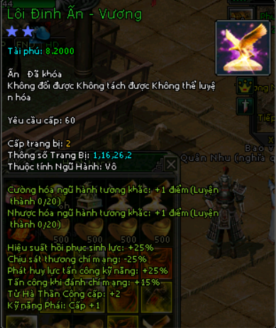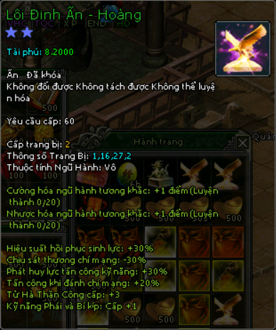 Mãnh Ấn Giáp Khóa![]() | Bạch Hổ Đường qua 1 tầng : 2 mãnh Tiêu Dao Cốc qua 1 ải : 1 Mãnh Bao Vạn Đồng : 10 mãnh Quân Doanh: 10 mãnh |