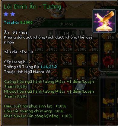 | 2000 Mãnh Ấn Giáp + 2000 Danh Bổ Lệnh + 1000 vạn đồng + 20 Rương Cao Quý + 1 Lôi Đình Ấn Úy | 90 | ![]() |